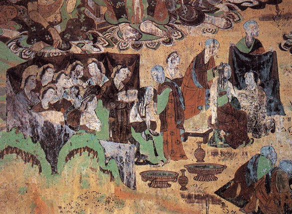 敦煌研究院第一任院长常书鸿先生曾说:220窟的壁画构图设色都不亚于意大利文艺复兴时期的教堂装饰绘画。220窟开凿于初唐贞观十六年(642年),陆续完成于高宗龙朔二年